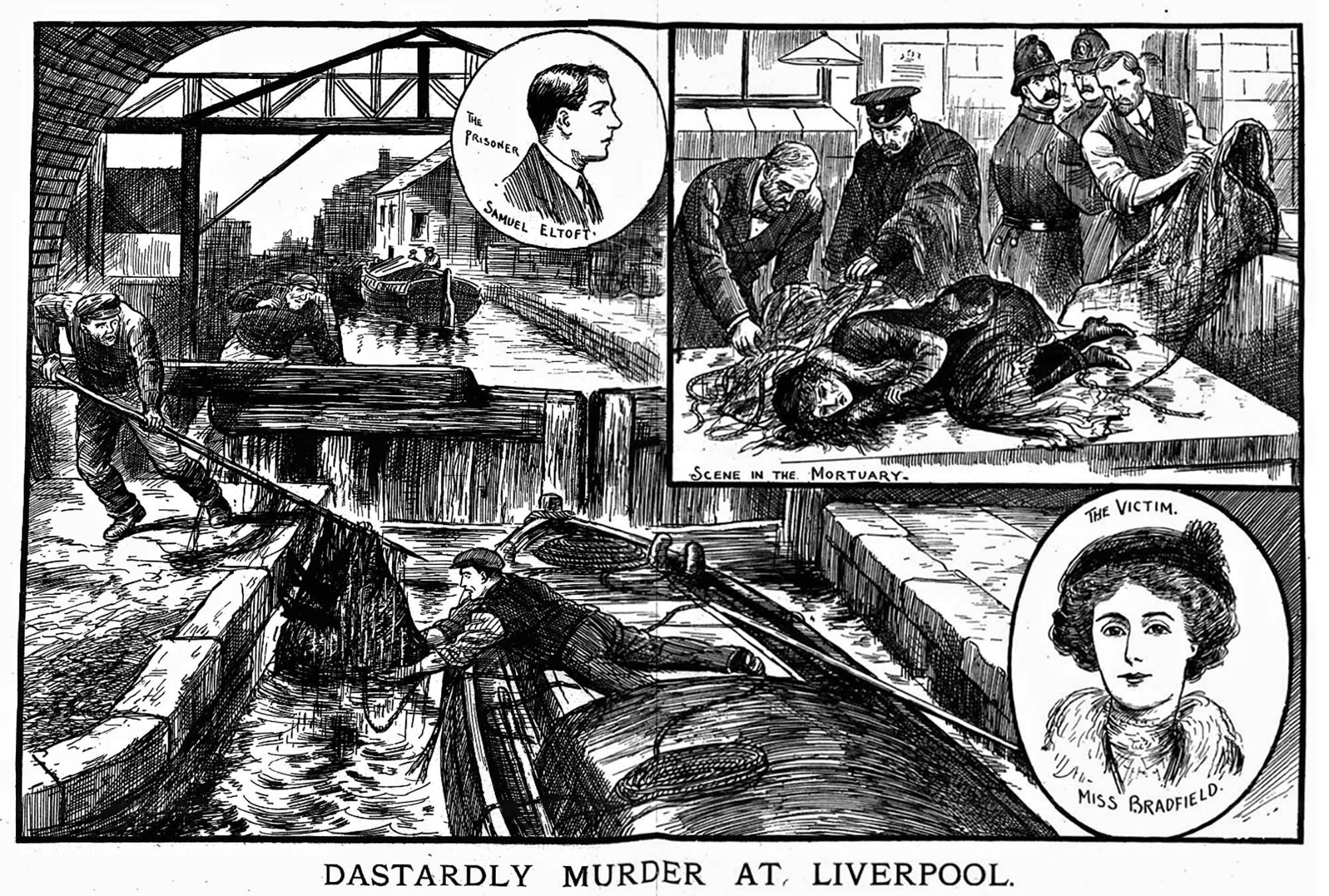 George Ball was employed as a packer by Christina Bradfield's brother. On 10 December 1913 he beat her about the head with a marlin spike that he used for his work and then, with the help of an accomplice, an 18 year old cart boy with the company, he trussed her up in a sack and dumped her in a nearby canal.